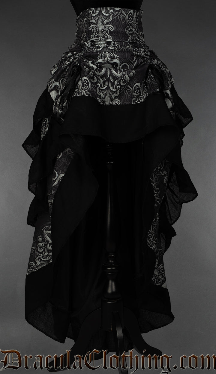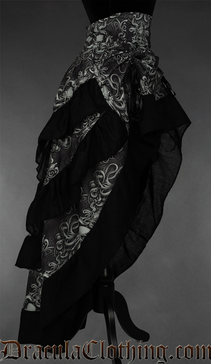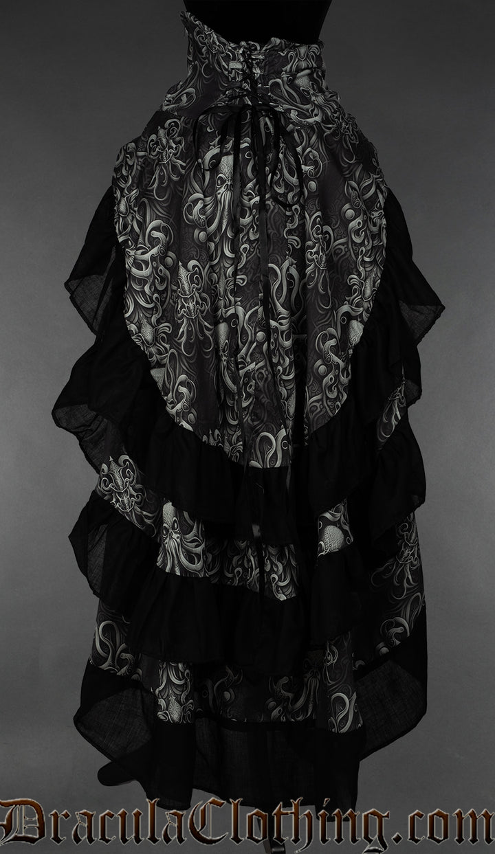 Grey and black kraken inspired printed women's bustle skirt shown with the front raised by two strings