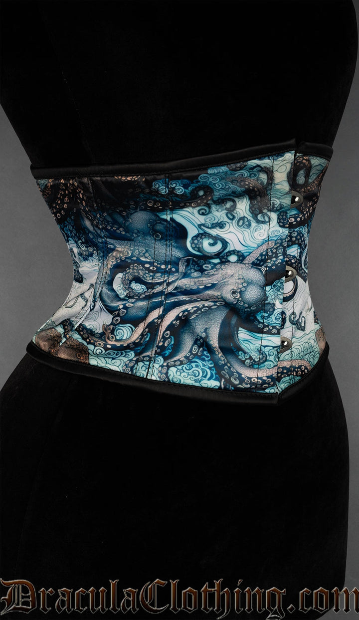 The kraken waist cincher is made with the kraken print on the outside and cotton lining on the inside.
