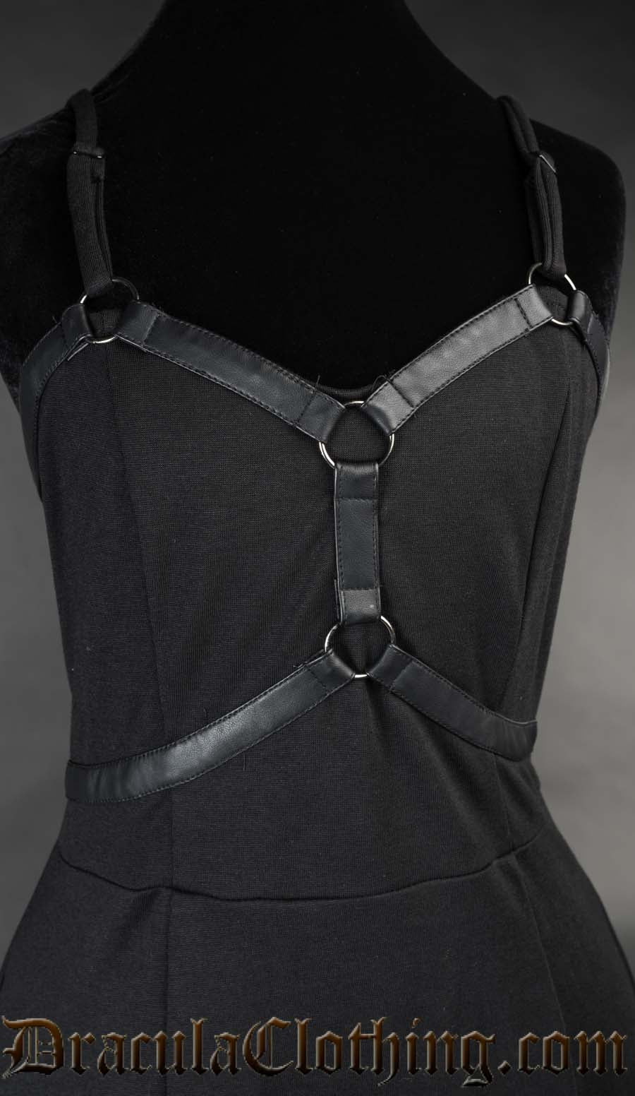 - Features a built-in faux leather harness with gunmetal silver O-rings that frames the bust