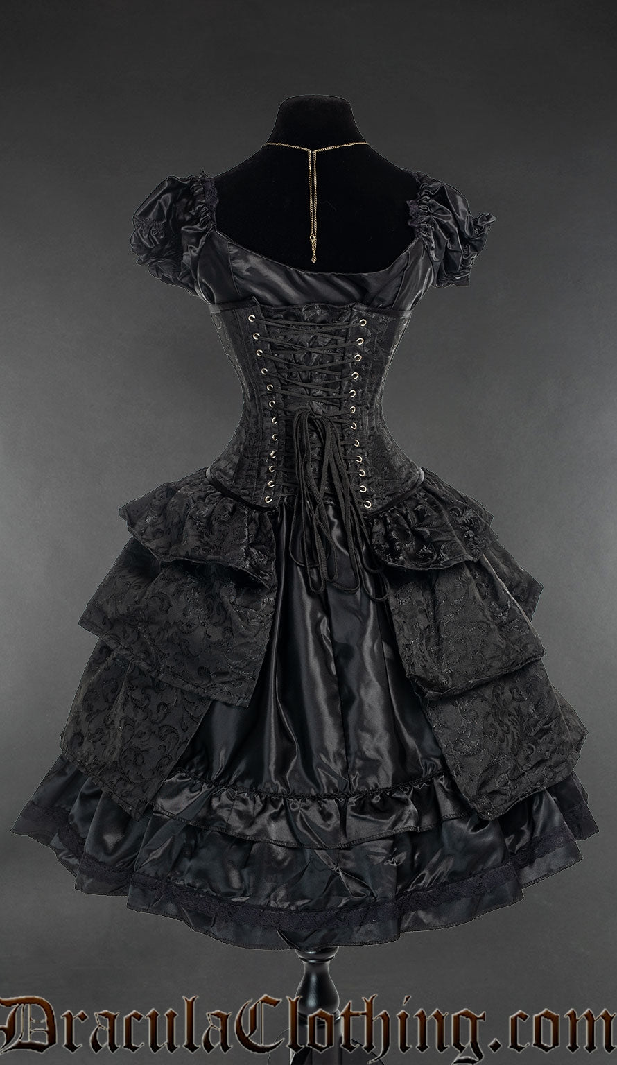 The black brocade bustle corset is made with black brocade on the outside and thick black cotton lining on the inside.