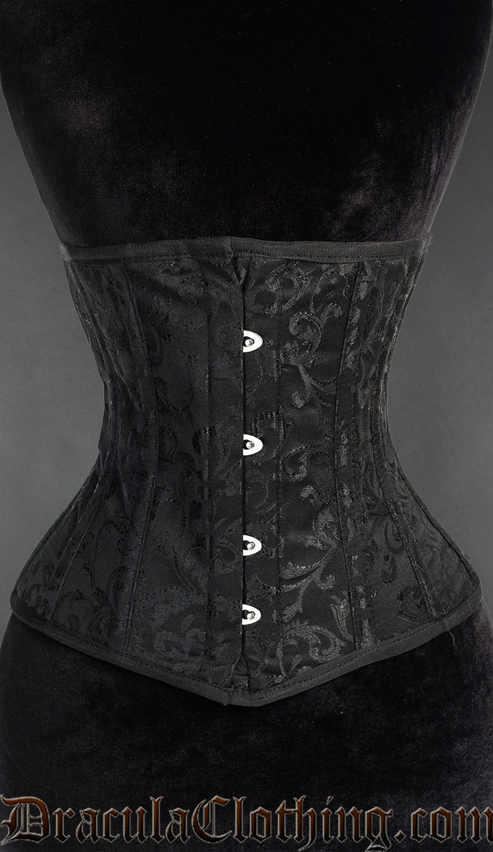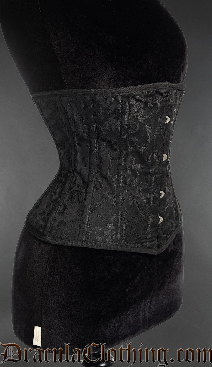 This waspie corset is crafted with a woven black brocade fabric on the outside, and lined with comfortable and durable cotton inside. The onyx material used here matches with many of our other onyx and black brocade clothing pieces, including dresses and skirts in the Ladies' collection and many pieces of Gentlemen's formal wear. This corset will look great as part of a matching couple outfit with your partner!