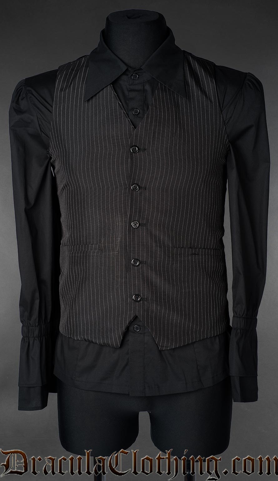 Men's pinstripe black formal vest waistcoat pictured over black long sleeve shirt