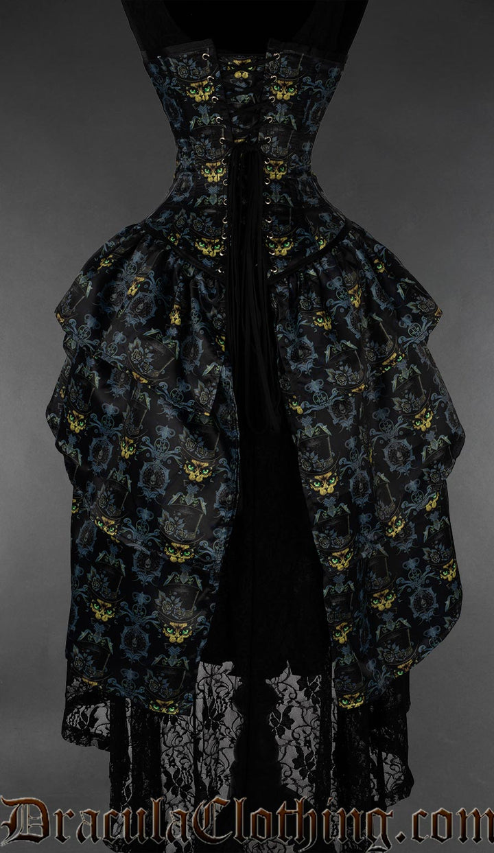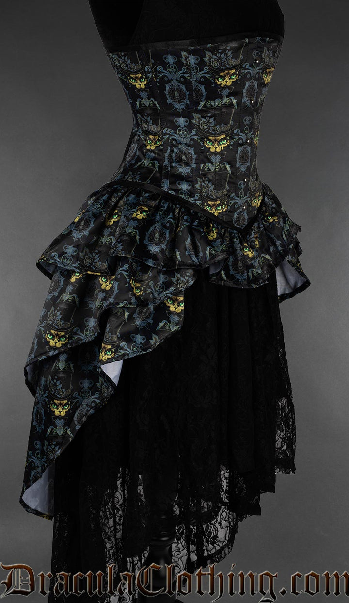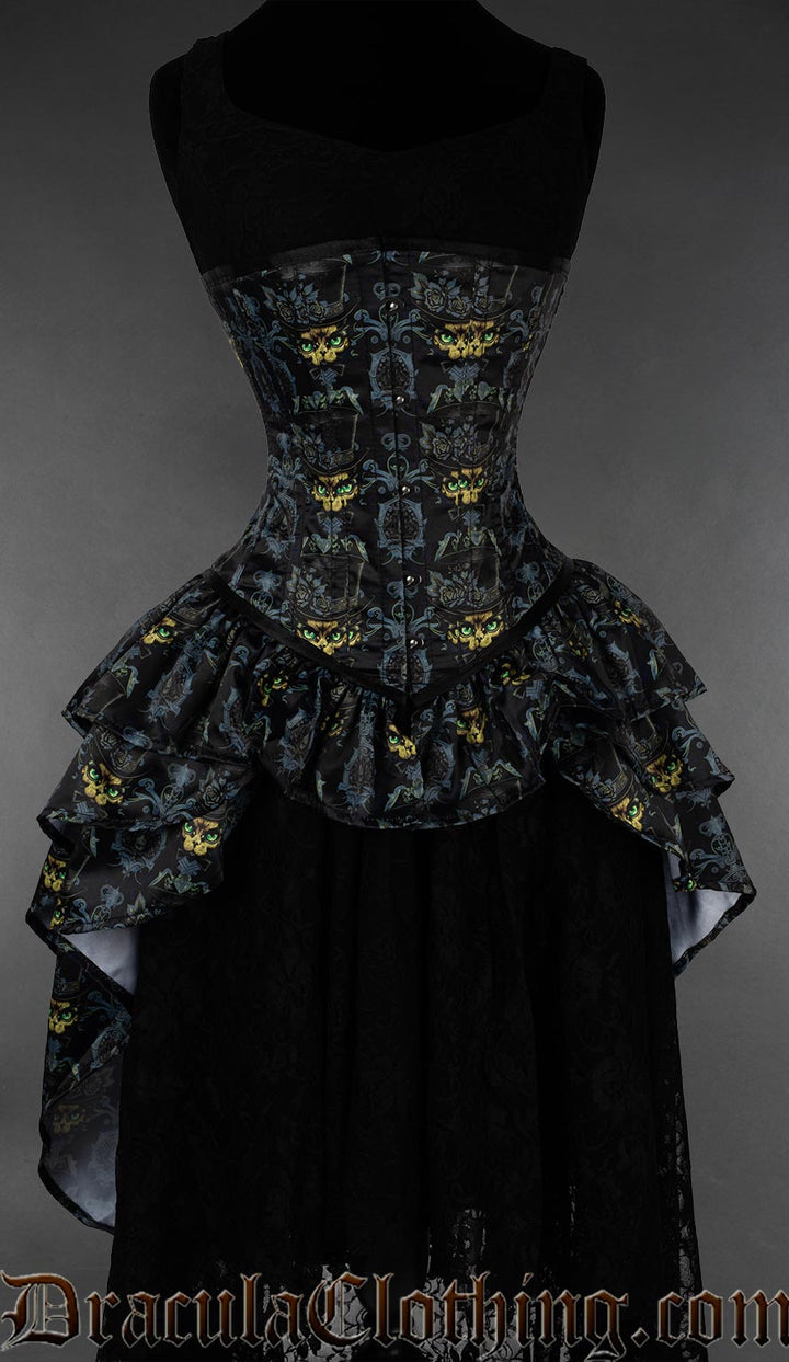 The purrfect Bustle Corset is made with a satin sphinx print on the outside and cotton lining on the inside.