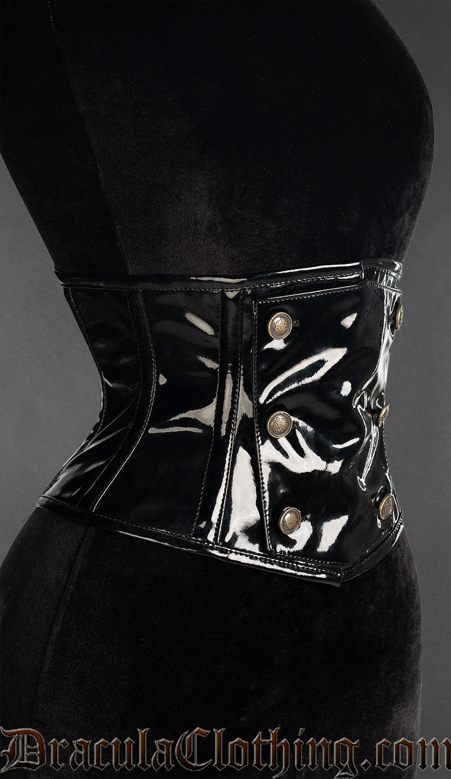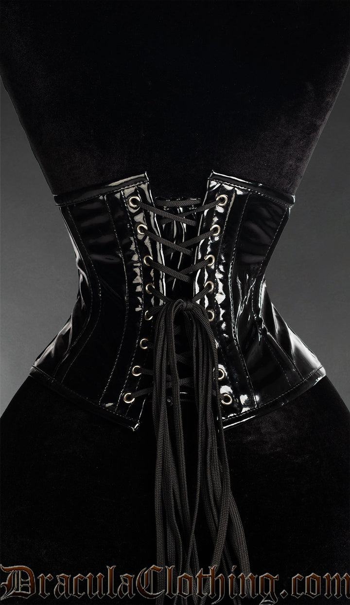The Black PVC waist cincher is made with black PVC on the outside and cotton lining on the inside.