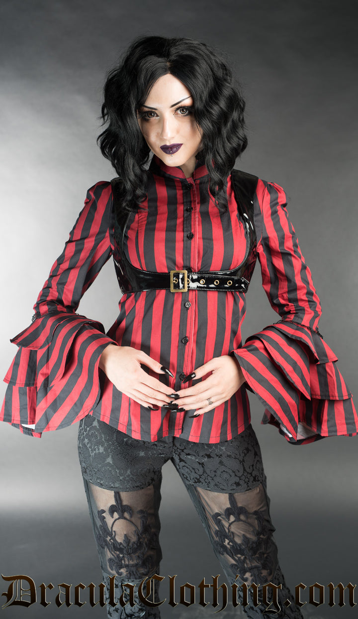 - Black and red striped cotton blouse with underbust buckle harness feature