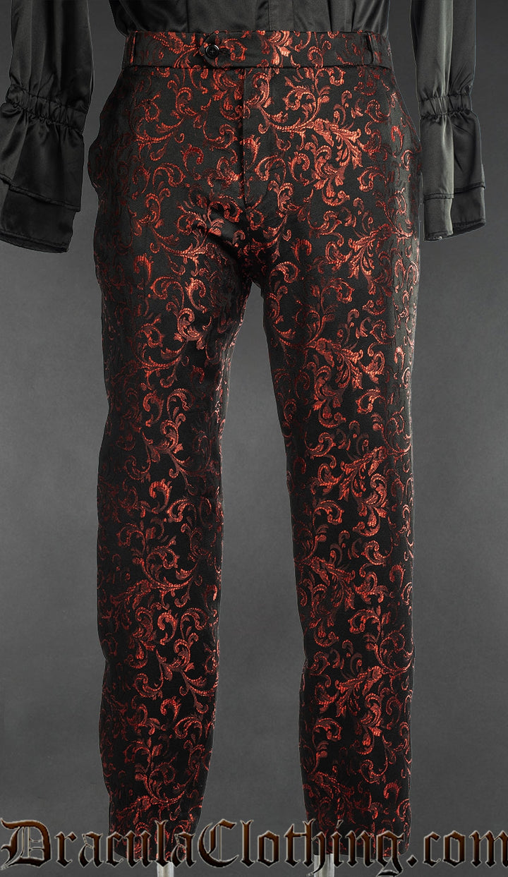 - Black pants with woven red details in the ruby style