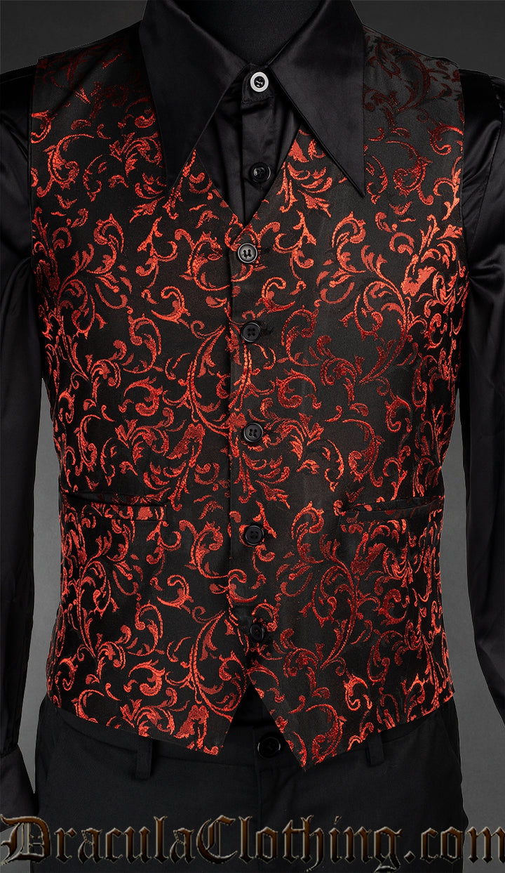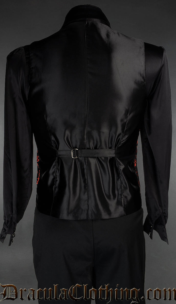 - Black button down vest with lustrous woven red details