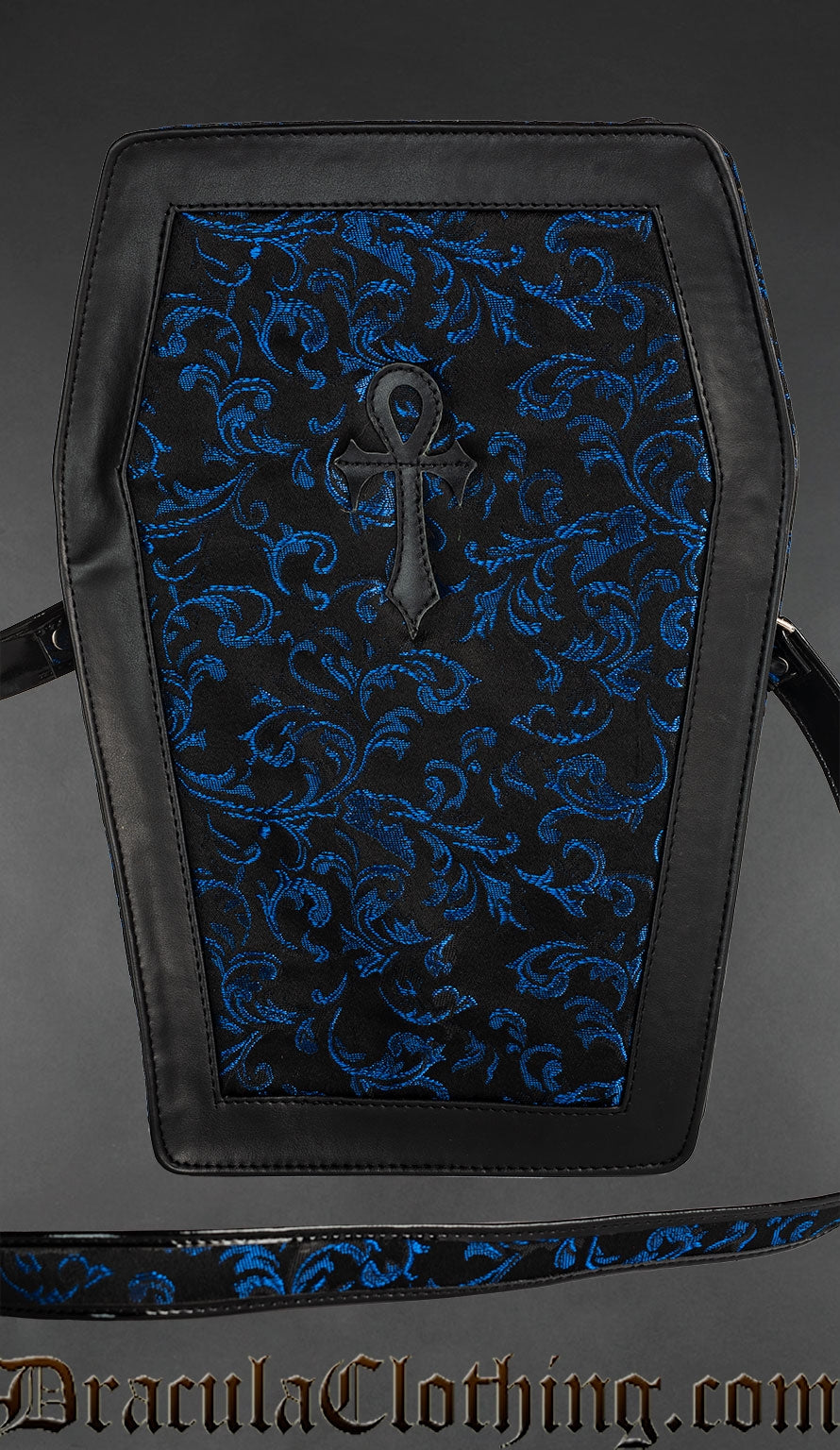 This bag is shaped like a coffin with faux leather details and an ankh in front.