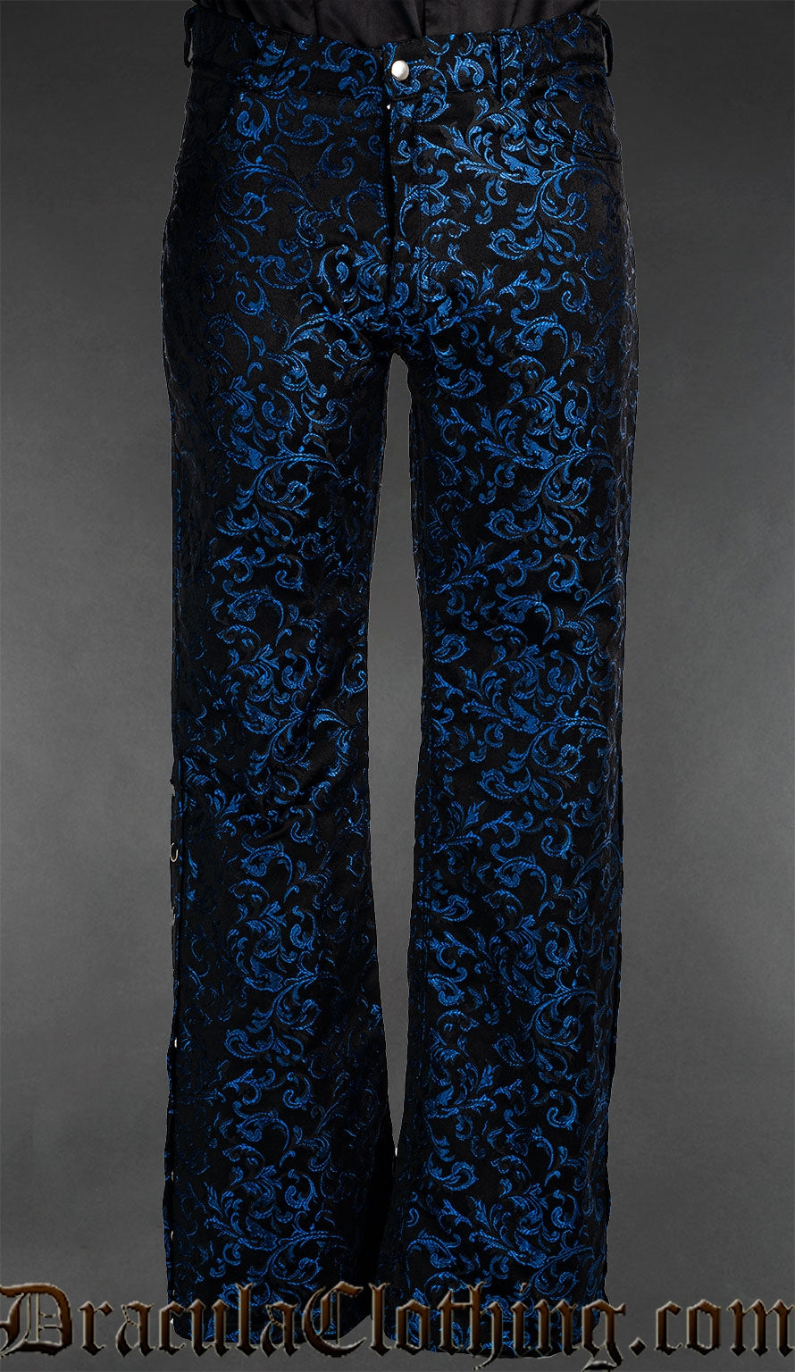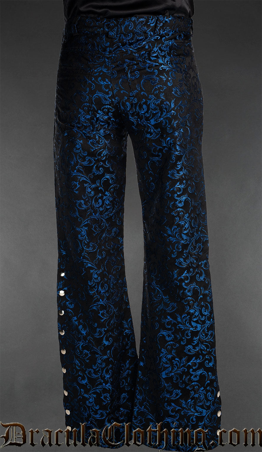 • Boot-cut pants made using high-quality black and blue brocade fabric
