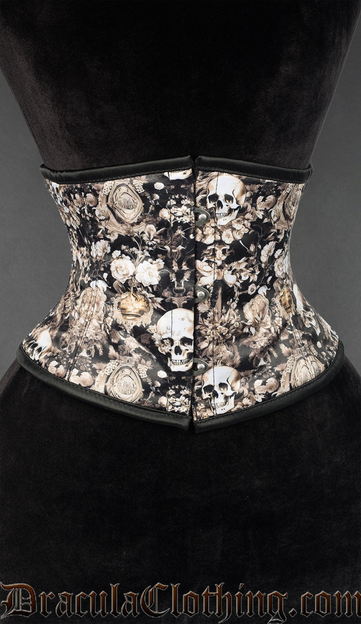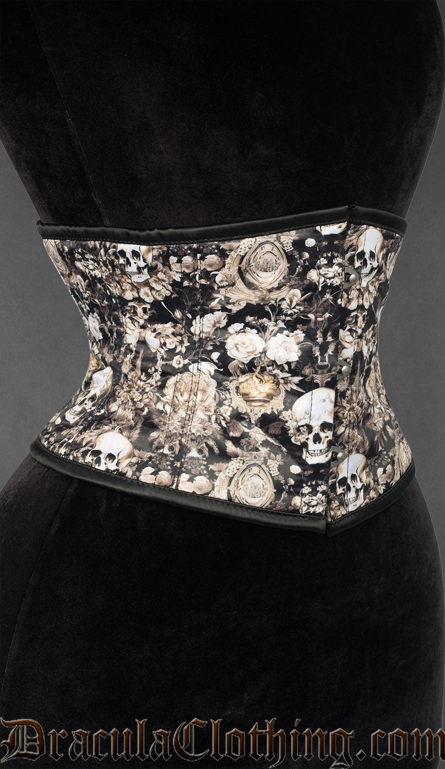 The skulls and flowers print waist cincher is made with a satin printed material on the outside and cotton lining on the inside.