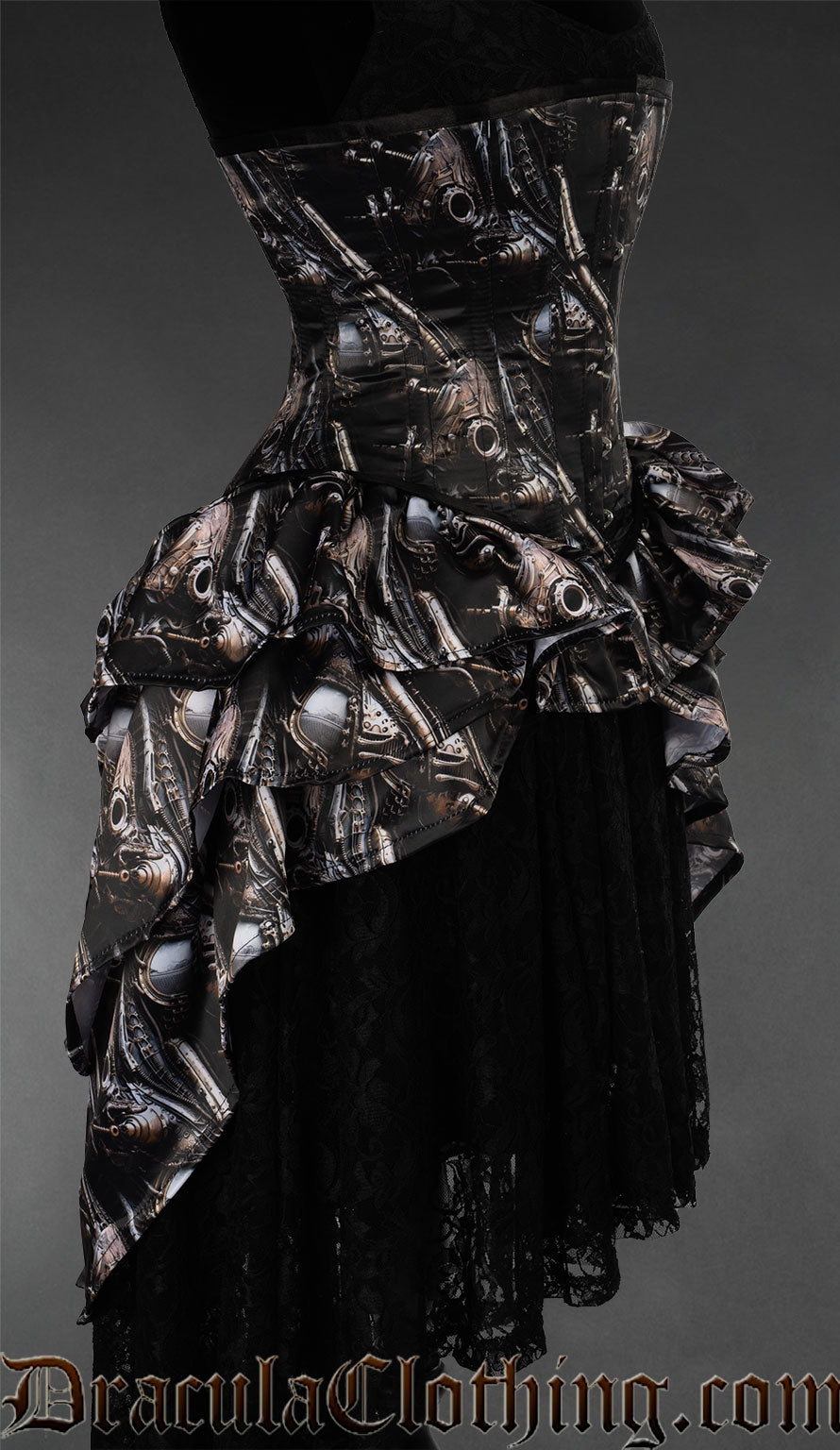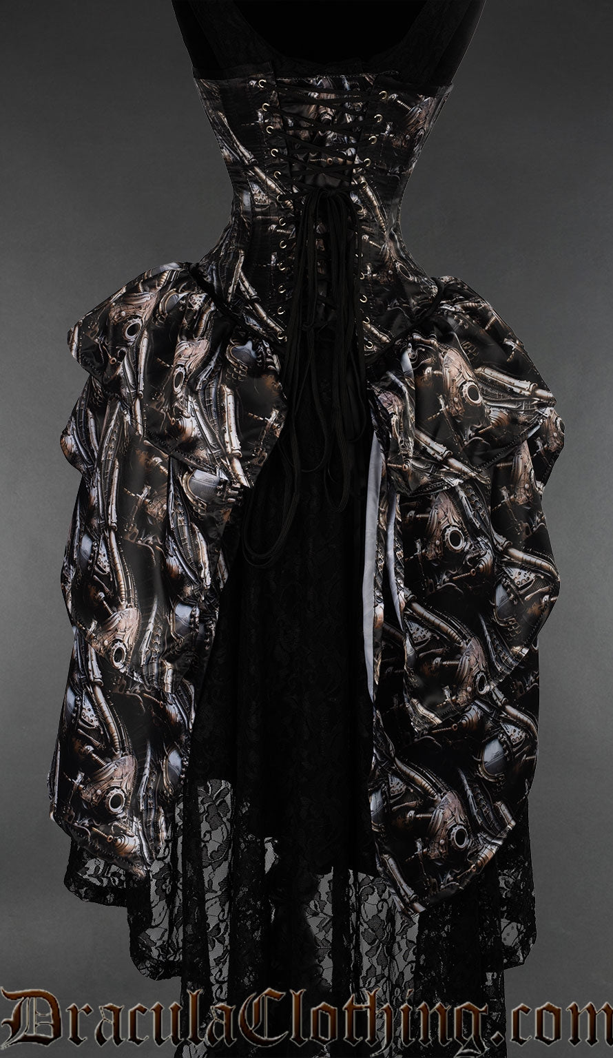 The steampunk bustle corset is made with a steampunk print on the outside and cotton lining on the inside. The corset has an attached skirt