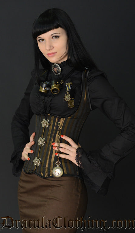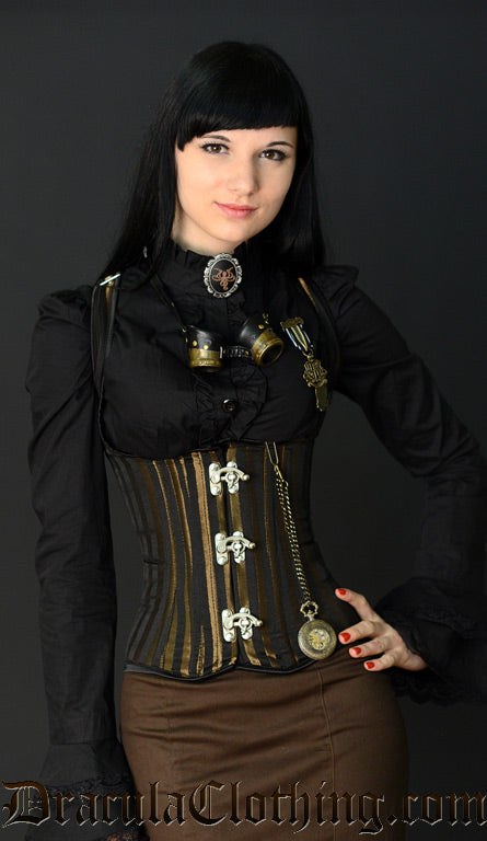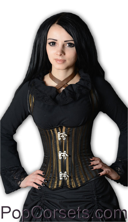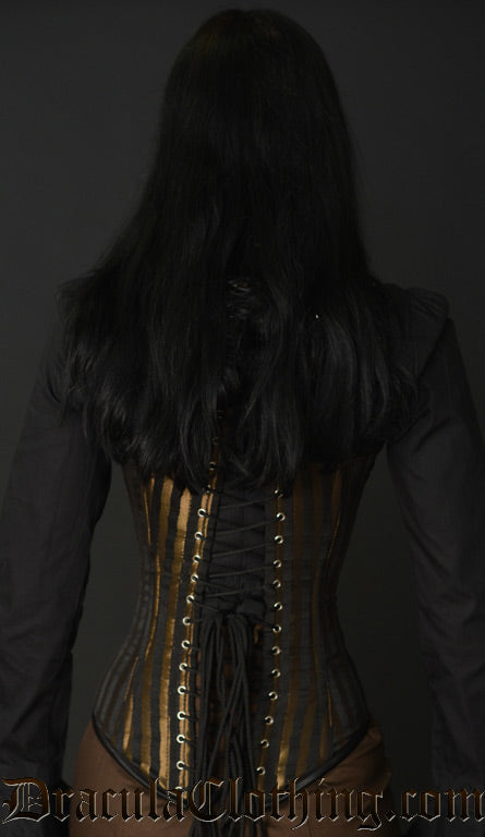 A high quality heavy corset that is fully steel boned with heavy spiral metal boning in the side and thick busk in the back and front. It has 4 steel boned busk in the back to give a sturdy feeling and a thick cotton lining.