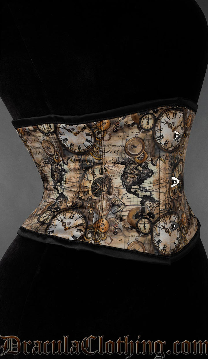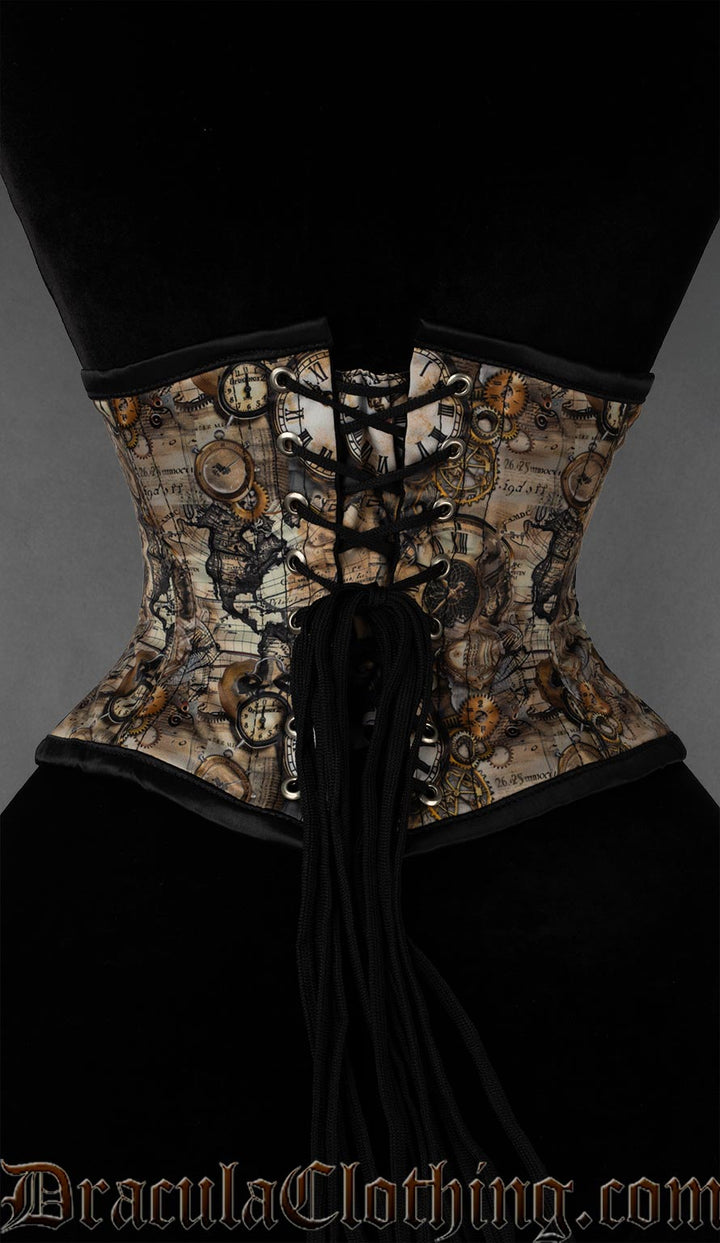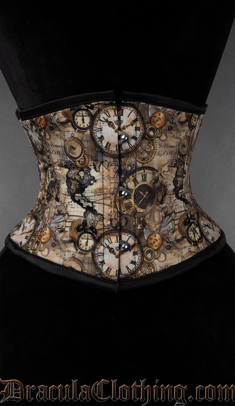 The steampunk waist cincher is made with a satin steampunk print on the outside and cotton lining on the inside.