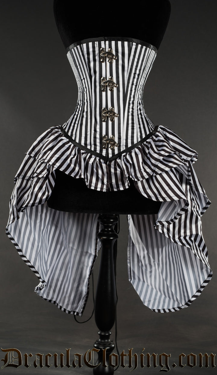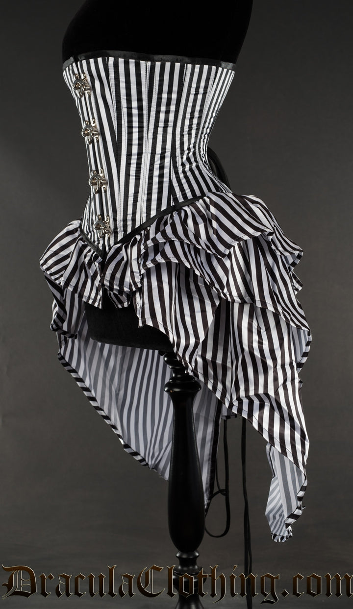 Side view of striped black and white bustle corset showing layered skirt attachment