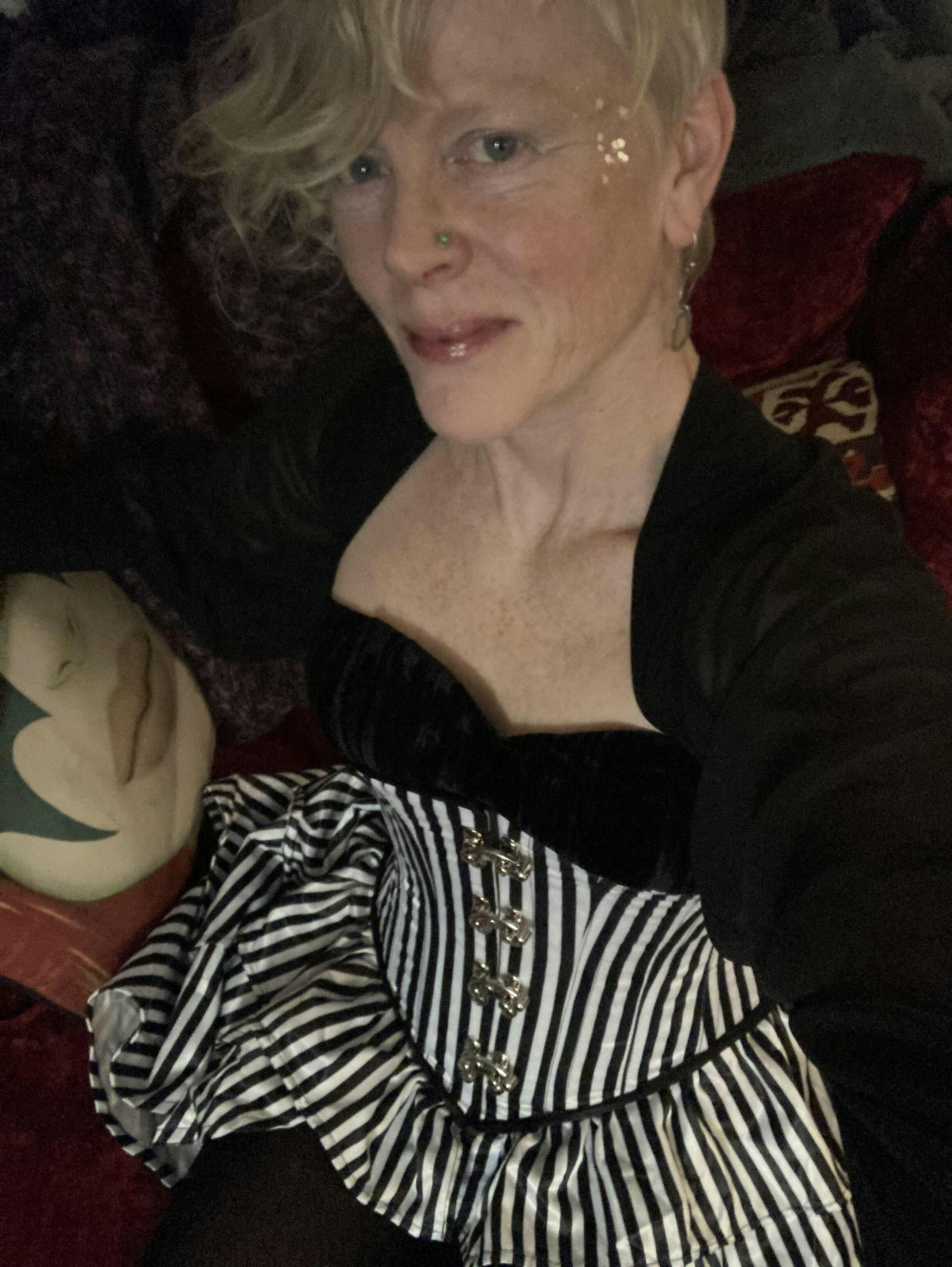 The Striped Bustle Corset is made with a black and white stripe print on the outside and cotton lining on the inside. This corset has an attached skirt
