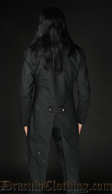 Model wearing men's black tailcoat jacket with decorative buttons and red lining