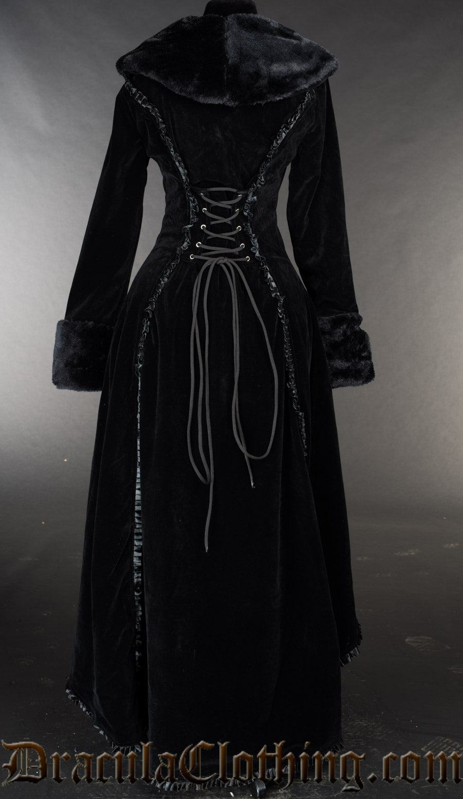 - Long black velvet coat with a high-low hem