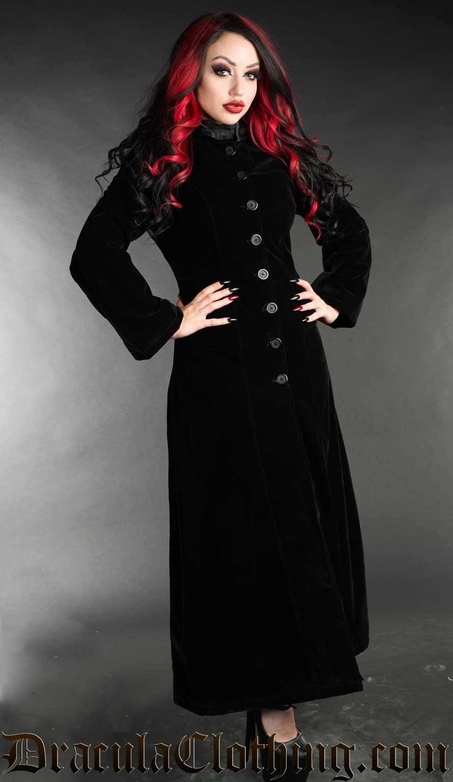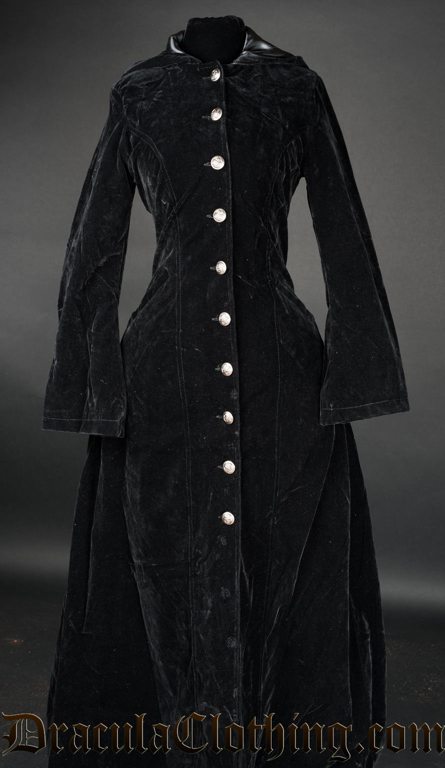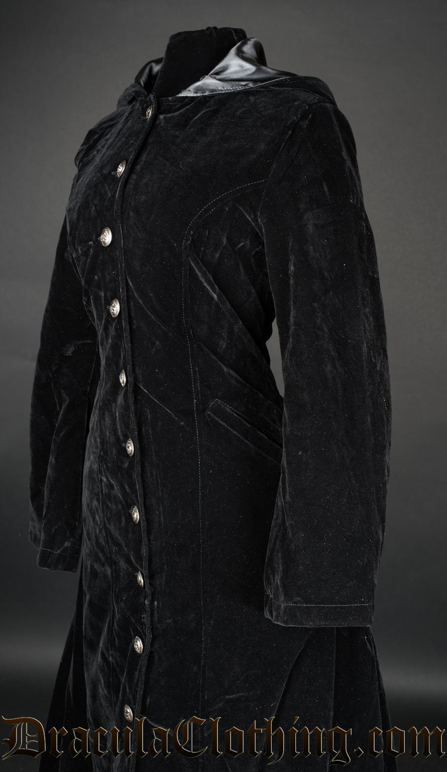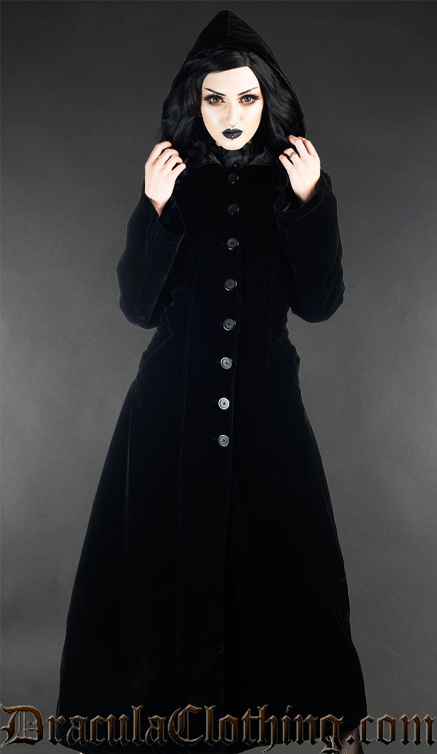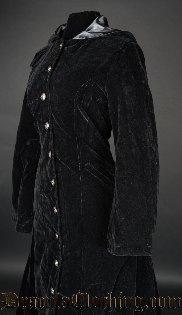 • Full length, hooded black velvet coat