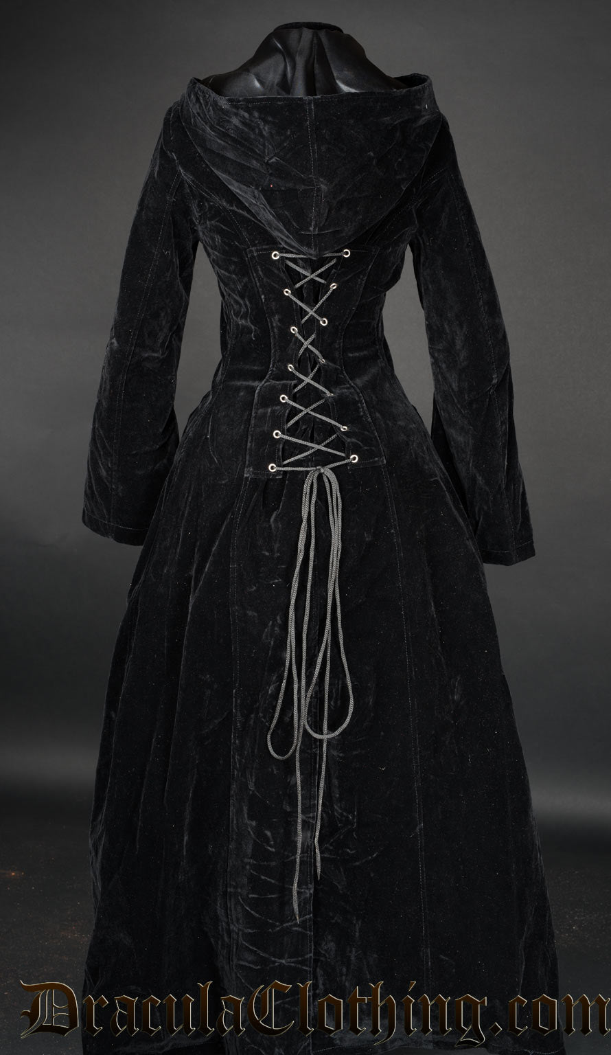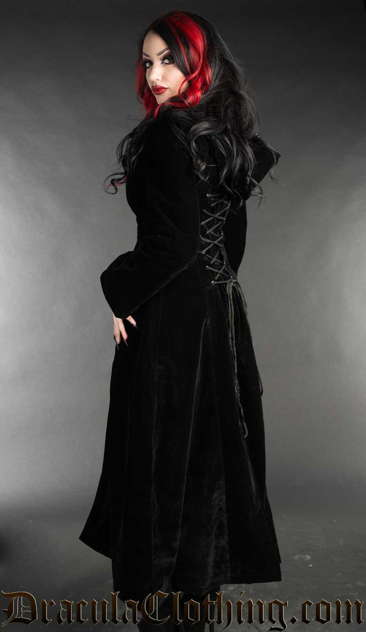 Back view of women's long black velvet coat showing adjustable corset lacing in the back and attached hood