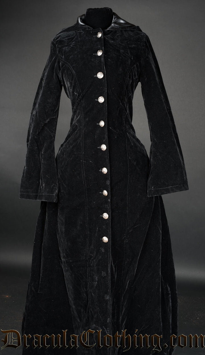 Women's long coat with centre button closure made from deep black velvet
