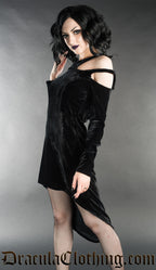 Women's black velvet high low dress with cold shoulder cut-outs shown on model