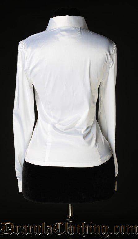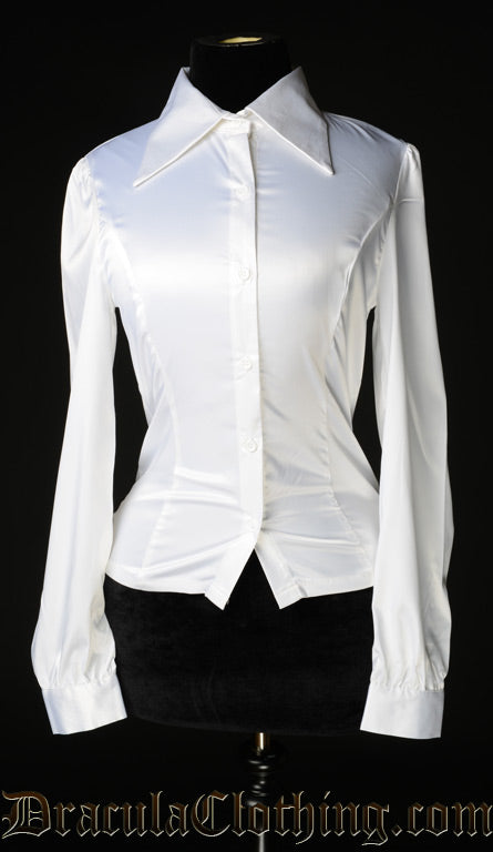 Fitted women's long sleeved white satin blouse with swallow tail collar